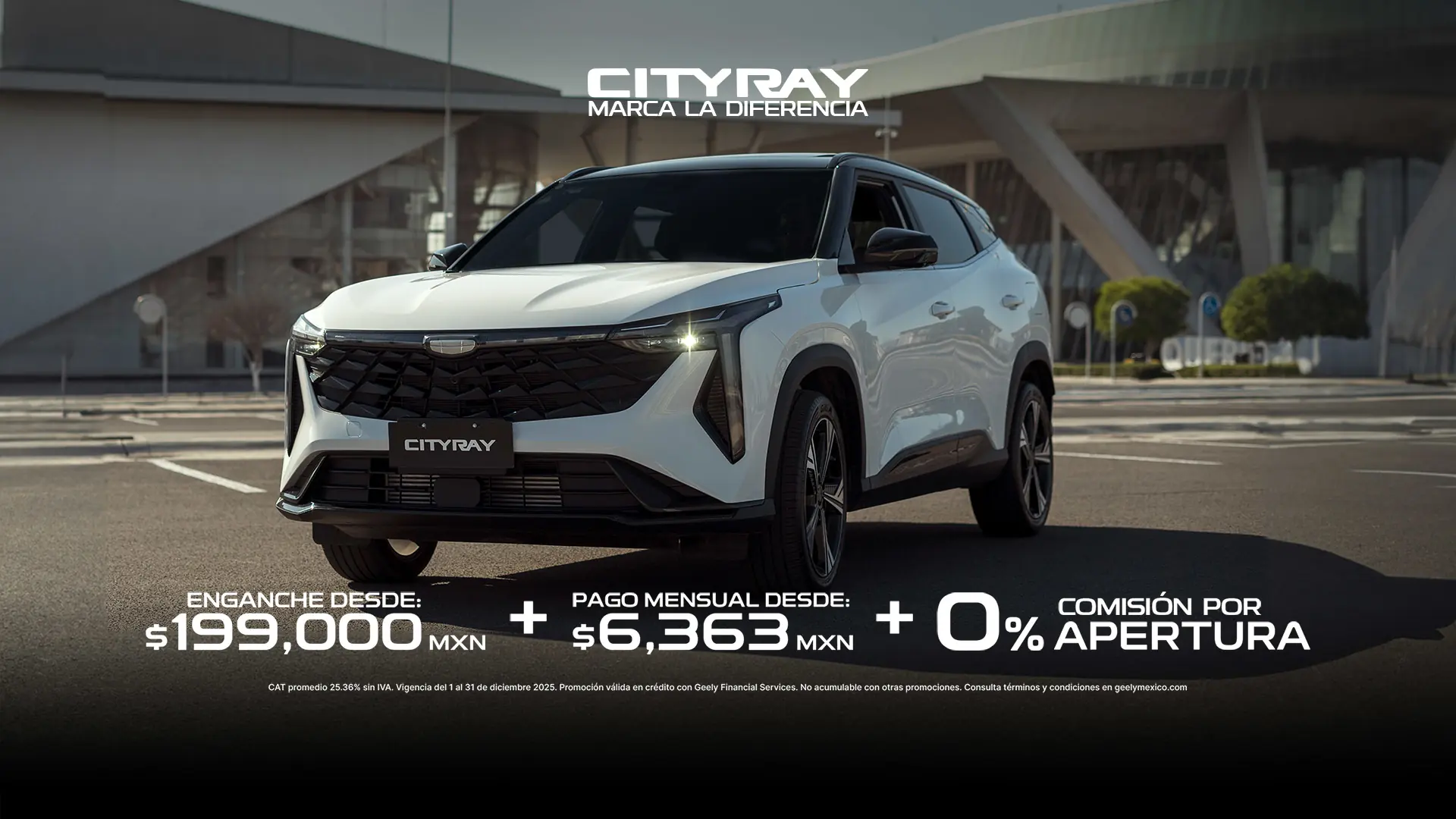 La mensualidad desde $6,363.00 MXN aplica únicamente con el plan de crédito simple, a través de Geely Financial Services (BBVA México S.A., Institución de Banca Múltiple), para el modelo Cityray 2025 en su versión GL 1.5T, con un enganche desde 40.70%, sobre un importe promedio a financiar de $289,990 MXN a un plazo promedio de 72 meses y tasa de interés ordinaria fija anual sin IVA del 12.99%. Esta oferta no incluye el costo del seguro, mismo que podrá ser cubierto de contado o financiado, conforme a lo estipulado en su contrato, y no es acumulable con otras promociones. Monto de la mensualidad publicada incluye IVA e impuestos. Aplica 2.5% de comisión por apertura en plan BASE o 0% Comision por apertura utilizando el plan BUEN FIN.