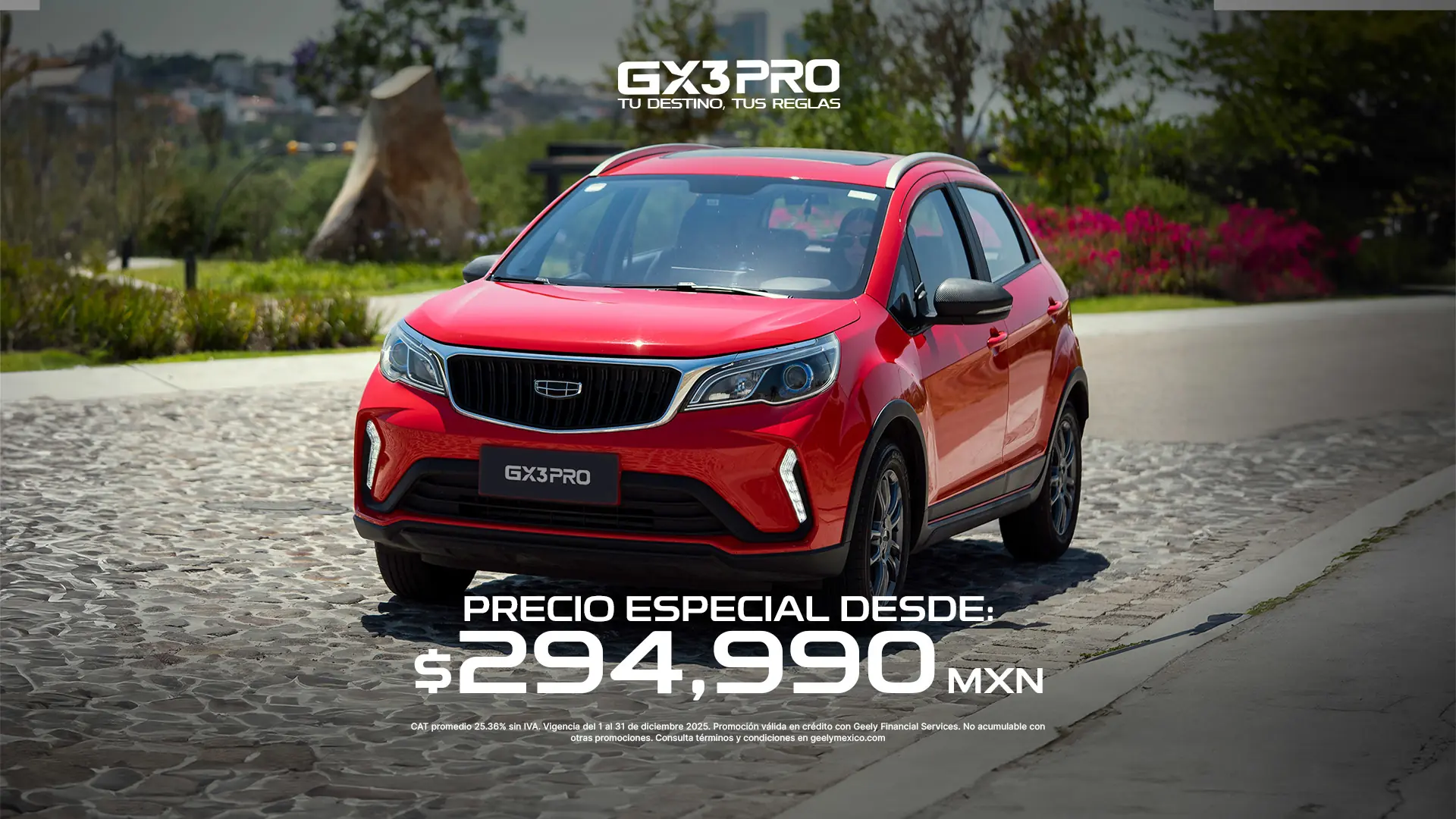 El precio de $294,990 MXN aplica al utilizar el Nuevo Bono Full con el plan de crédito simple, únicamente a través de Geely Financial Services (BBVA México S.A., Institución de Banca Múltiple), para el modelo GX3 Pro 2025 en su versión GC, sobre un precio de $329,990 MXN El Nuevo Bono Full a precio de $35,000 MXN (IVA Incluido no aplica seguro por un año gratis, y no es acumulable con otras promociones. Aplica 2.5% de comisión por apertura en plan BASE o 0% Comision por apertura utilizando el plan BUEN FIN.