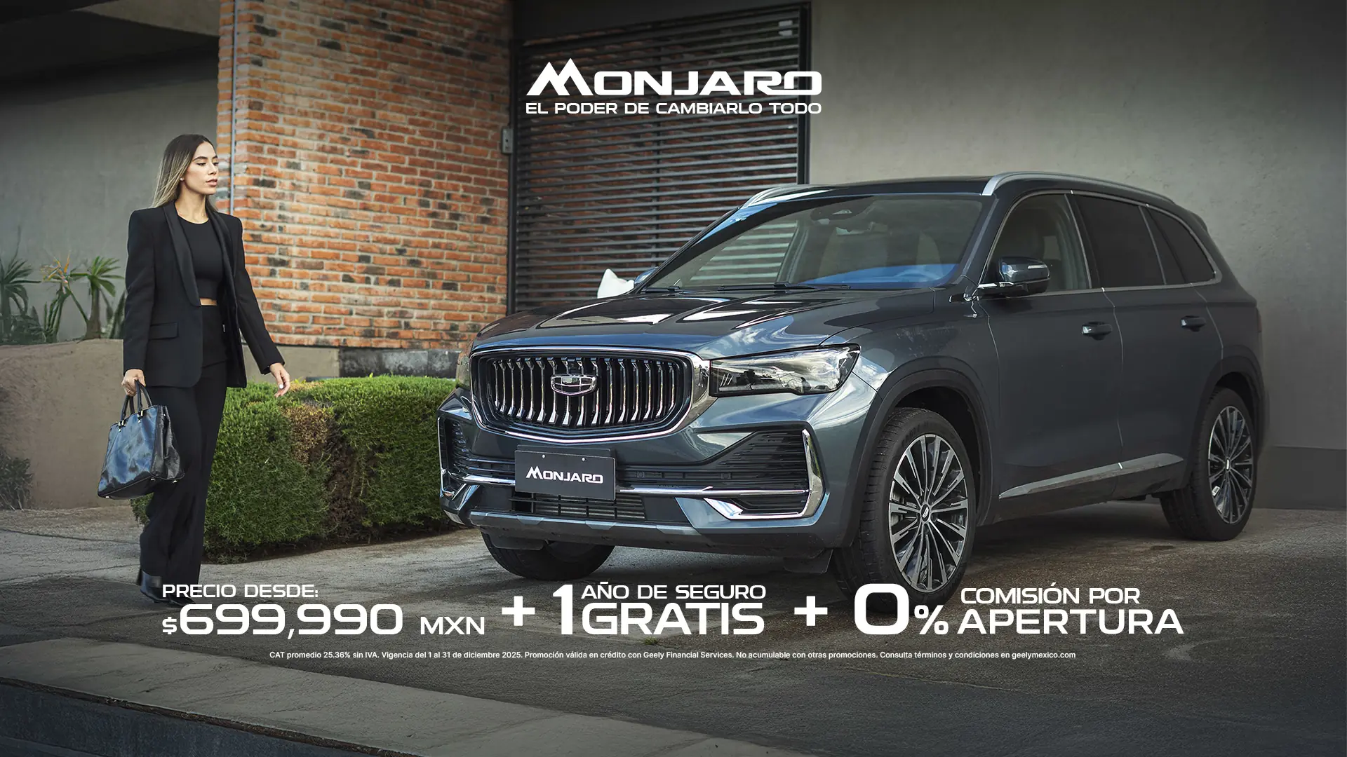 El año de seguro gratis aplica únicamente para el modelo Monjaro 2026 en su versión GF, en operaciones de crédito a través de Geely Financial Services (BBVA). Válido solo con aseguradoras participantes. Consulta especificaciones y condiciones con tu Distribuidor autorizado Geely. Al finalizar el periodo del seguro gratis, el cliente deberá contratar un seguro conforme a lo señalado en su contrato de crédito.